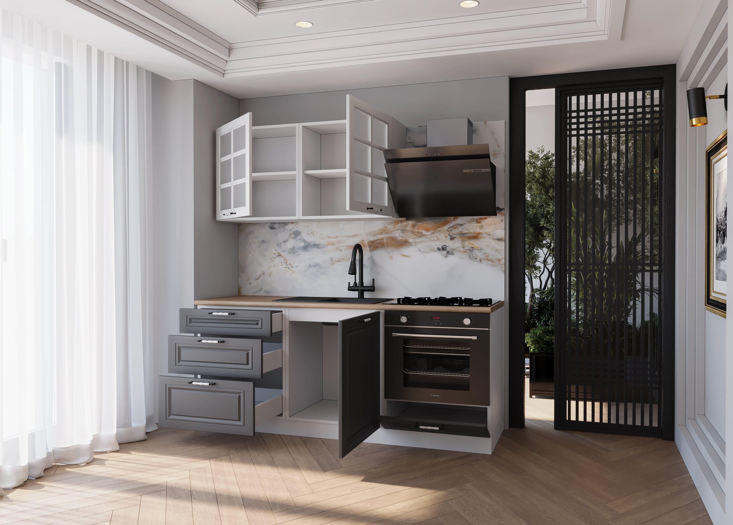 180 cm MDF Gövde Membran Kapak Üç Çekmeceli Aysu Hazır Mutfak – Antrasit -Beyaz