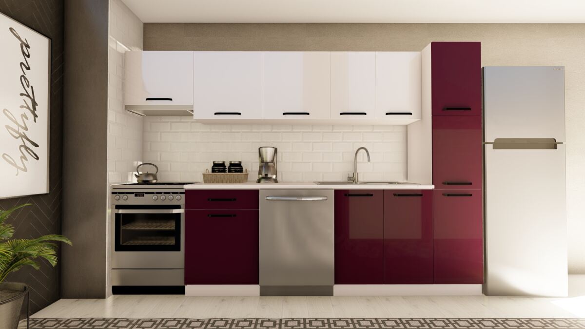 VİSAS CONCEPT _ 300 cm ZEHRA HAZIR MUTFAK DOLABI ASPİRATÖR ve KİLER MODÜLLÜ PARLAK MÜRDÜM ve BEYAZ